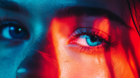 A dramatic close-up of a blue eye under creative red and blue lighting, representing vision, focus, and creativity in a surreal, artistic setting.