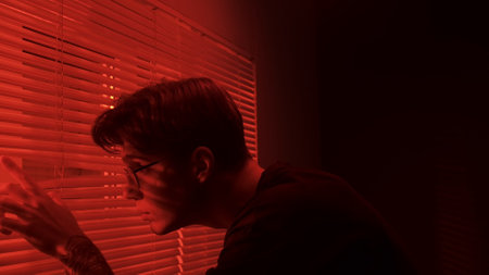 Portrait of male in dark room. Handsome man near window, red neon light shines behind jalousie, guy checks outside opens blinds with finger.