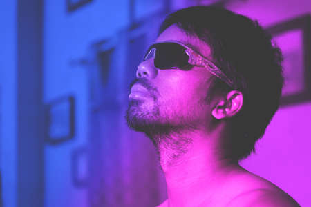 Dream. Lonely Asian man on blue and pink studio background in mixed neon light. Cool handsome model. concept of human emotions facial expressions sales advertisement fashion copy space