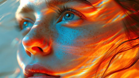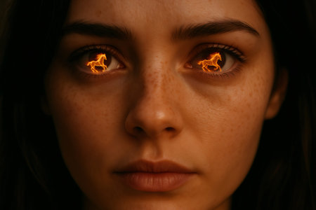 Close up portrait of a young woman with fiery horse silhouettes reflected in her eyes, creating a surreal and captivating image