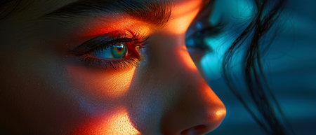 Futuristic artificial intelligence. Woman face in red blue azure colors. Human and artificial intelligence interaction concept. mental world. Psychology and Technology. Generative ai.