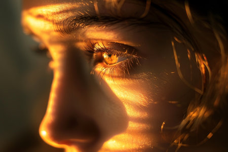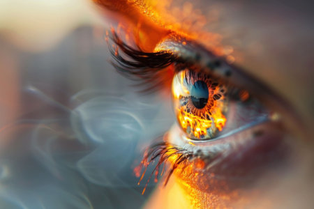 Close up of a human eye reflecting vibrant orange and golden colors, capturing intricate details and a serene expression