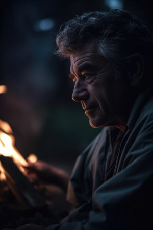 shot of a man looking at the flames on an outdoor fire, created with generative ai
