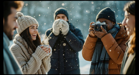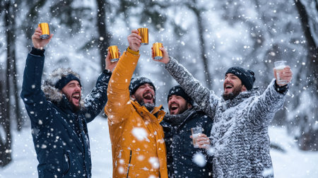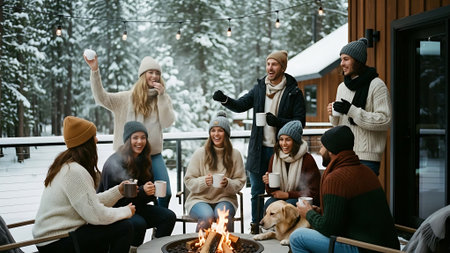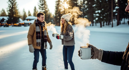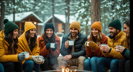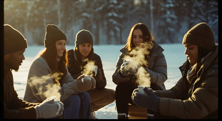 A group of friends enjoying hot beverages in a snowy landscape, dressed in winter clothing, smiling and laughing together