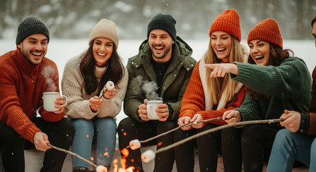 Group of friends drinking hot tea and roasting marshmallows in winter forest