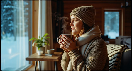 A woman in a cozy sweater and hat holding a steaming cup in a snowy forest, with a sled nearby and sunlight filtering through the trees