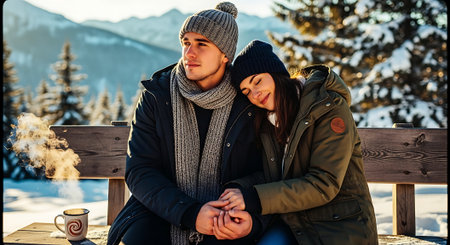 Young couple in winter clothes sitting on a wooden bench in the mountains