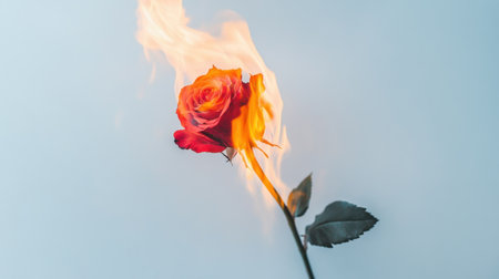 A red rose on fire, burning brightly against a white ceramic background, creating a powerful and dramatic image.