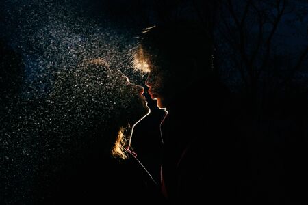 Loving couple silhouette in dark. Back light and spray. Beautiful effect.