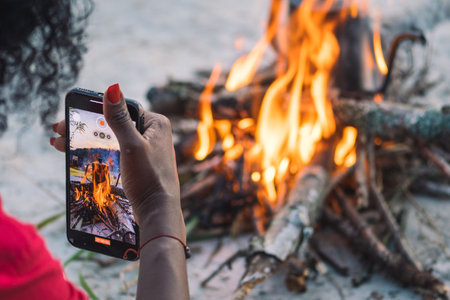 Girl taking photo with smartphone while preparing coffee to tea on an open fire with branches and flames outdoor in the nature