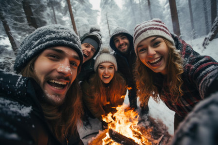 Group of cheerful friends taking selfie while camping and warming up around bonfire in snowy winter forest