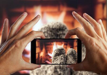 Hand making photo Feet in woollen socks by the fireplace