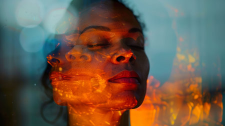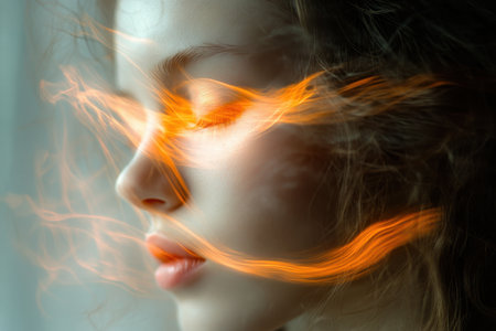 A young woman appears calm as glowing energy swirls around her face during golden hour, creating an ethereal look.