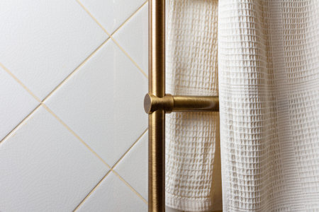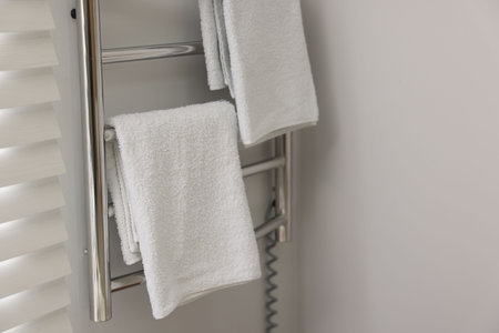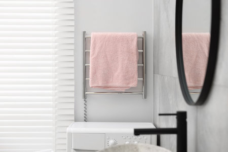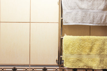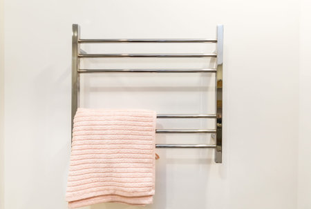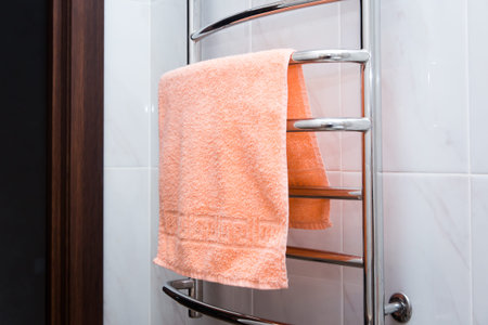 Warm towel hanging on a heated rack in a bathroom during the evening