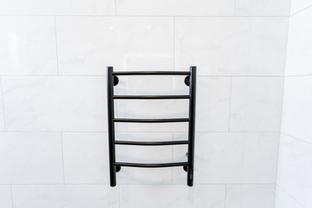A sleek, modern black towel rack is elegantly hanging on a stunning marble wall in a stylish bathroom, adding a touch of contemporary design to the overall decor and functionality of the space