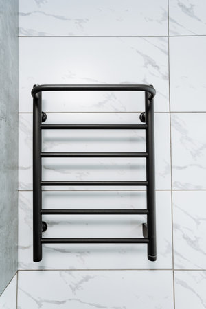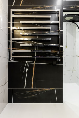 Wall-mounted towel dryer in the shower room. Marble white walls in the bathroom. Metal heated towel rail. Modern room.