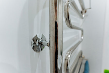A closeup of a polished chrome towel heater with a sleek glass divider in a modern bathroom, showcasing a stylish and functional design that creates an inviting and relaxing atmosphere