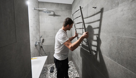 Male plumber hanging electric towel rack dryer on the wall in bathroom. Man installing stainless steel bath towel heater in apartment under renovation. Home renovation concept.