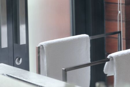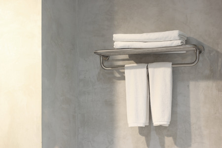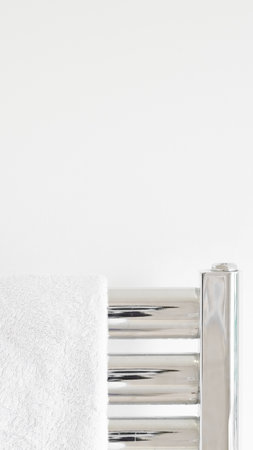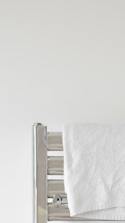 Minimalist bathroom with white towel on chrome rail, bright and clean design