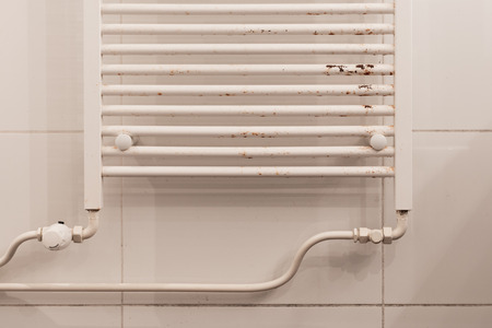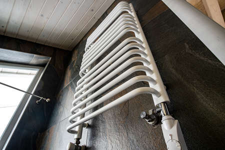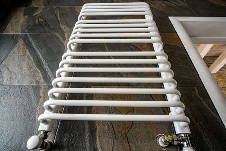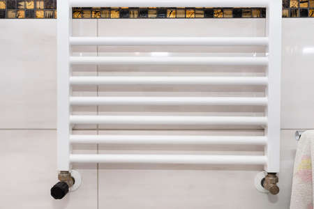 Close up of a modern white bathroom heater on wall with tiles. Bathroom hydraulic equipment.