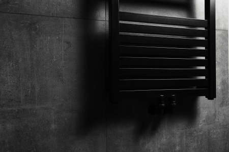 Photo of black matte heated towel rail, in the bathroom with dark grey walls.