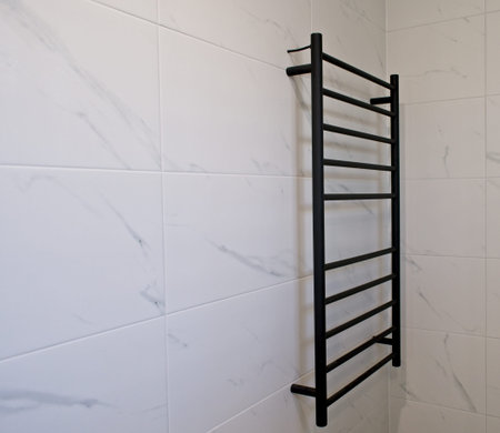 White contemporary electric towel dryer mounted on black tiled wall in modern bathroom.