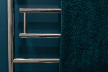 Chrome heated towel rail on dark background in blue and green bathroom.