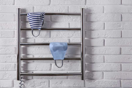 Modern heated towel rail with warm soft towel on white brick wall. Space for text