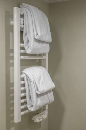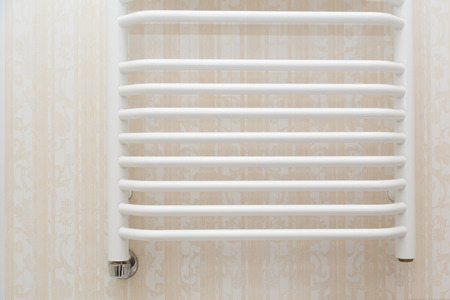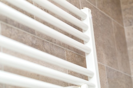 Modern Heated Towel Rail On Bathroom Wall. Modern white Heated Towel Rail