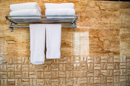 Four clean white towels on holder in hotel bathroom with textured black wall. Modern minimal style