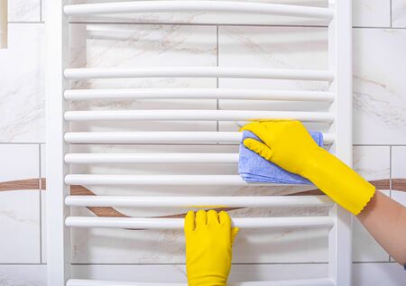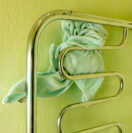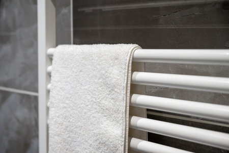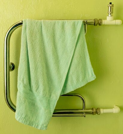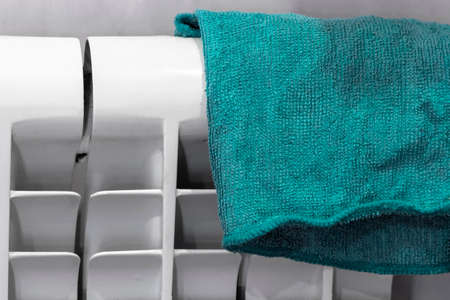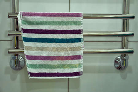 Towels heat up on a modern design radiator in the bathroom. Closeup view of a towel ready to use after a bath or a shower. Glimpse of the interior of a house or hotel. Warmth softness, comfort concept