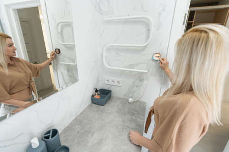 Plumber in medical mask installs electric heated towel rail in bathroom