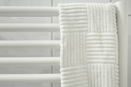 Clean white towel draped over a metal heater, minimalist bathroom aesthetic
