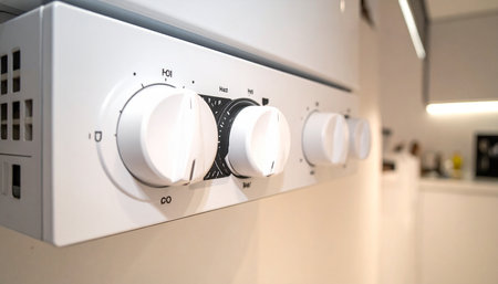 Close-up of control panel of gas boiler with dials and pressure gauge, showing heating settings and temperature indicators in domestic environment