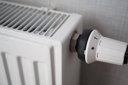 A close-up of a radiator with a temperature control dial mounted on a white wall. The image focuses on the sleek, modern design of the radiator and its easy-to-use temperature adjustment feature, functionality of the heating system, comfortable indoor environment