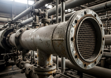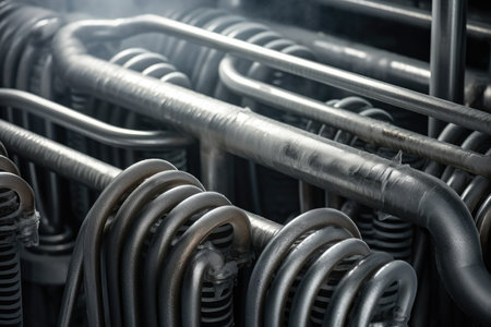 This image showcases a detailed close-up of an industrial metal coil structure, highlighting its intricate design and textured surface, suitable for engineering topics.