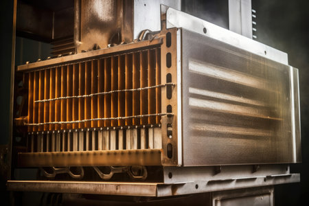 Macro shot of an Electrostatic Precipitator with charged metal plates collecting particulate matter in an industrial setting
