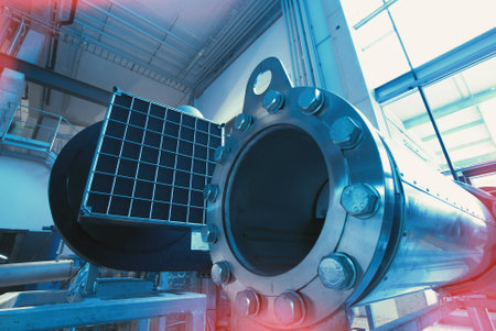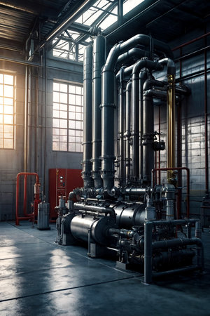 This image depicts an industrial facility featuring a large ventilation fan and an intricate piping system within a production environment, showcasing modern technology and engineering design.