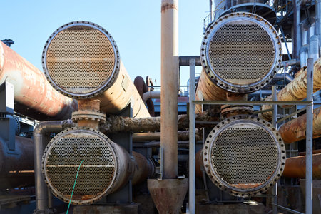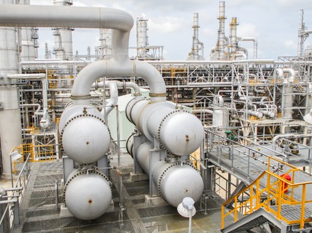 Heat exchangers in a refinery. The equipment for oil refining.Heated gasoline air cooler