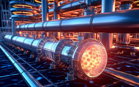 Complex arrangement of pipes and machinery highlights the artistry of industrial design through sleek lines and striking color contrasts.