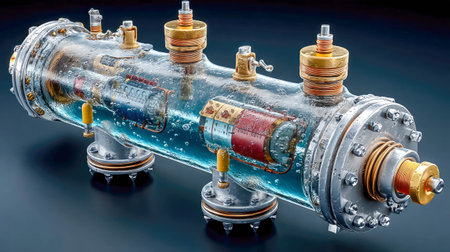 Transparent mechanical device filled with water and gears, combining liquid and industrial engineering.