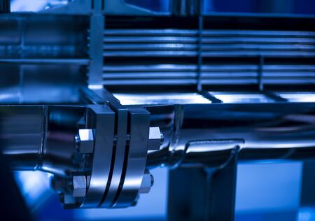 A close up of a group of metal pipes as industrial background. pipes are silver and have a shiny appearance. Concept of industrial Chemical pharmaceutical device