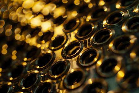 A close-up shot reveals a metallic array with round openings bathed in warm golden light, creating depth and visual complexity. The design highlights an industrial aesthetic.