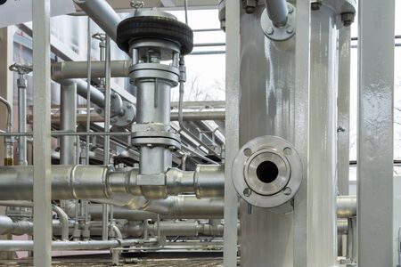 Steel pipes at beer factory - brewery equipment. Production, manufacture, industrial concept