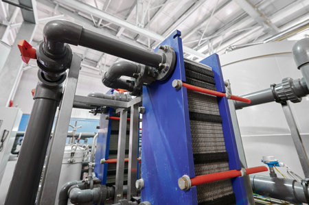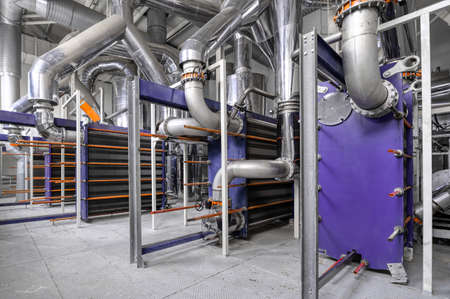 Copper pipes system connecting to industrial heat exchanger in modern factory.