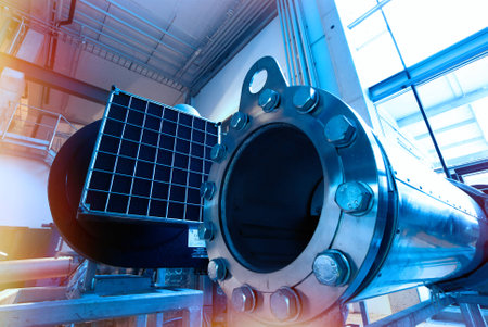 Detail of industrial clean heat exchanger, a shell and tube condenser, made from stainless steel.