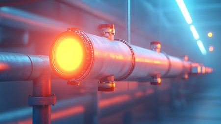 A captivating view of industrial pipes and machinery in a dimly lit factory, showcasing a stunning interplay of blue and orange lighting, highlighting the intricate details of the structure.