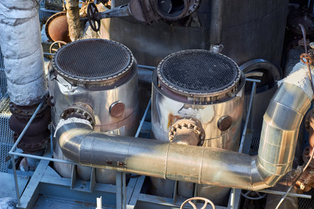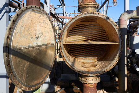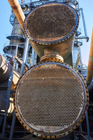 Industrial two section heat exchangers or boiler tubes bundle and valves. Two huge heat exchangers shell and tubes opened for revision repairing and deposits cleaning at petrochemical enterprise.