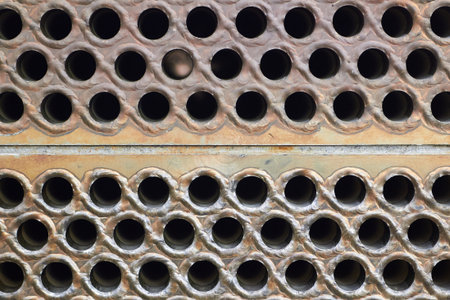 Tube sheet plate of heat exchanger or boiler closeup texture macro industrial background with insoluble hard mineral deposits salts scale welding seams and corrosion. Trypophobia concept.
