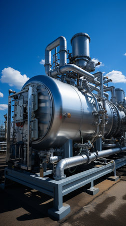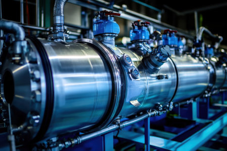 Sleek stainless steel machinery with valves and gauges is positioned in a processing facility focusing on efficiency.